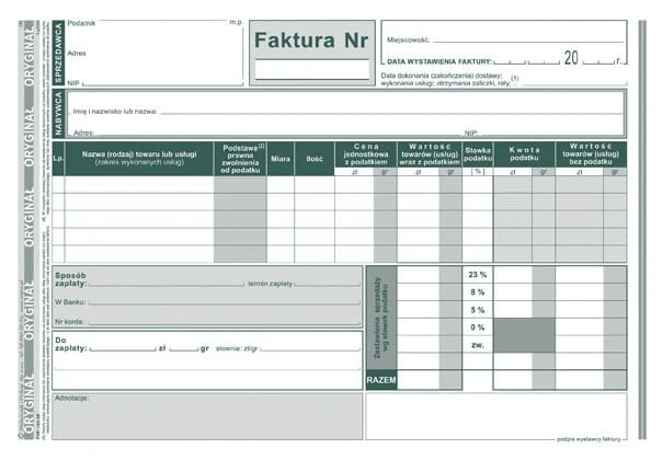 | zastosowanie: | faktury i inne dokumenty wynikające z przepisów o podatku od towarów i usług |