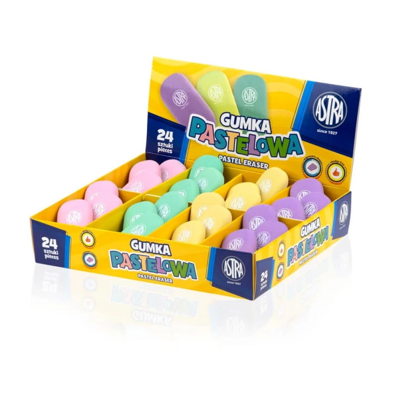 Gumka występuje w 4 pastelowych kolorach: zielonym, różowym, fioletowym i żółtym.