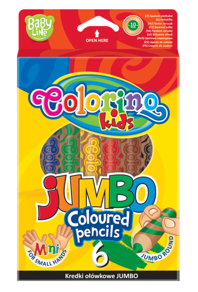 Mega duża kredka dla malutkich artystów, którzy dopiero rozpoczynają swoją przygodę z rysowaniem. Colorino Kids wprowadzi w świat kolorów i kształtów. Kredka Colorino JUMBO 1+ została opracowana specjalnie z myślą o najmłodszych. Optymalna wielkość dopasowana do malutkich rączek i okrągły kształt pozwolą pewnie trzymać kredkę. Duży – aż 10 milimetrowy – zaokrąglony rysik ułatwia rysowanie i jednocześnie zapewnia bezpieczeństwo.