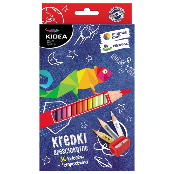 Zestaw 36 kredek o intensywnych kolorach. Szeroka gama kolorów pozwala na tworzenie różnorodnych prac. W skład zestawu wchodzi kredka koloru złotego i srebrnego oraz temperówka, która przyda się do zaostrzenia kredek.