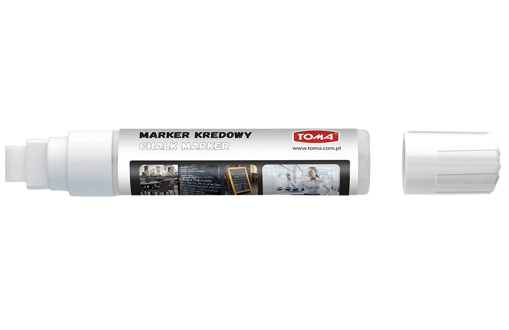 Marker z płynną kredą, do pisania po tablicach czarnych, białych, po szkle i powierzchniach plastikowych. Zmywalny wodą np. tradycyjną gąbką, do użytku wewnątrz pomieszczeń, nasączenie końcówki fibrowe, bezwonny tusz pigmentowy, nie zawiera xylenu.