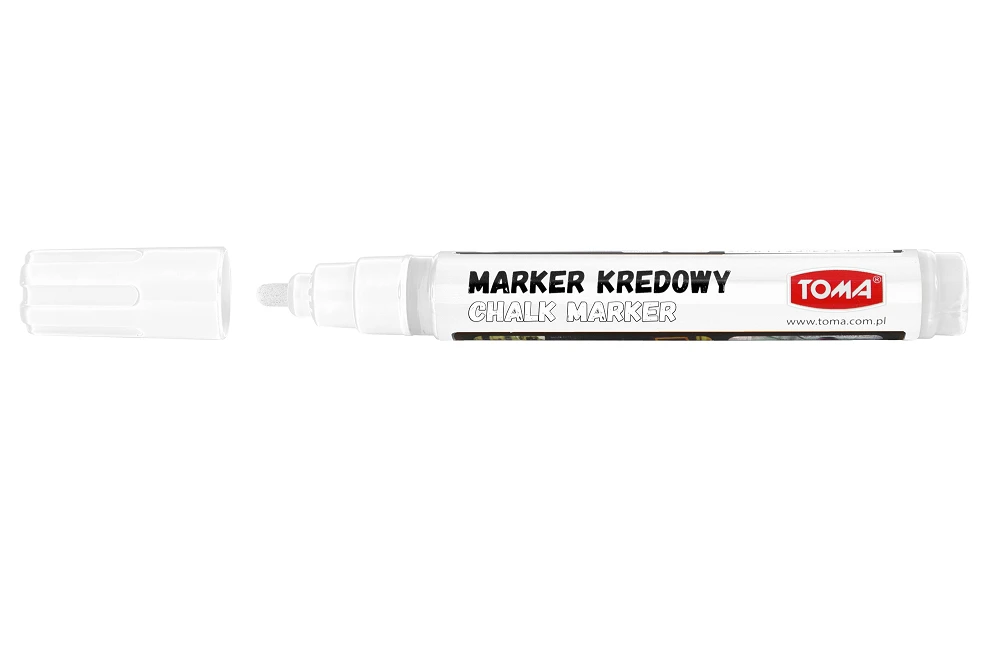 Marker z płynną kredą, do pisania po tablicach czarnych, białych, po szkle i powierzchniach plastikowych. Zmywalny wodą np. tradycyjną gąbką, do użytku wewnątrz pomieszczeń, nasączenie końcówki fibrowe, bezwonny tusz pigmentowy, nie zawiera xylenu.