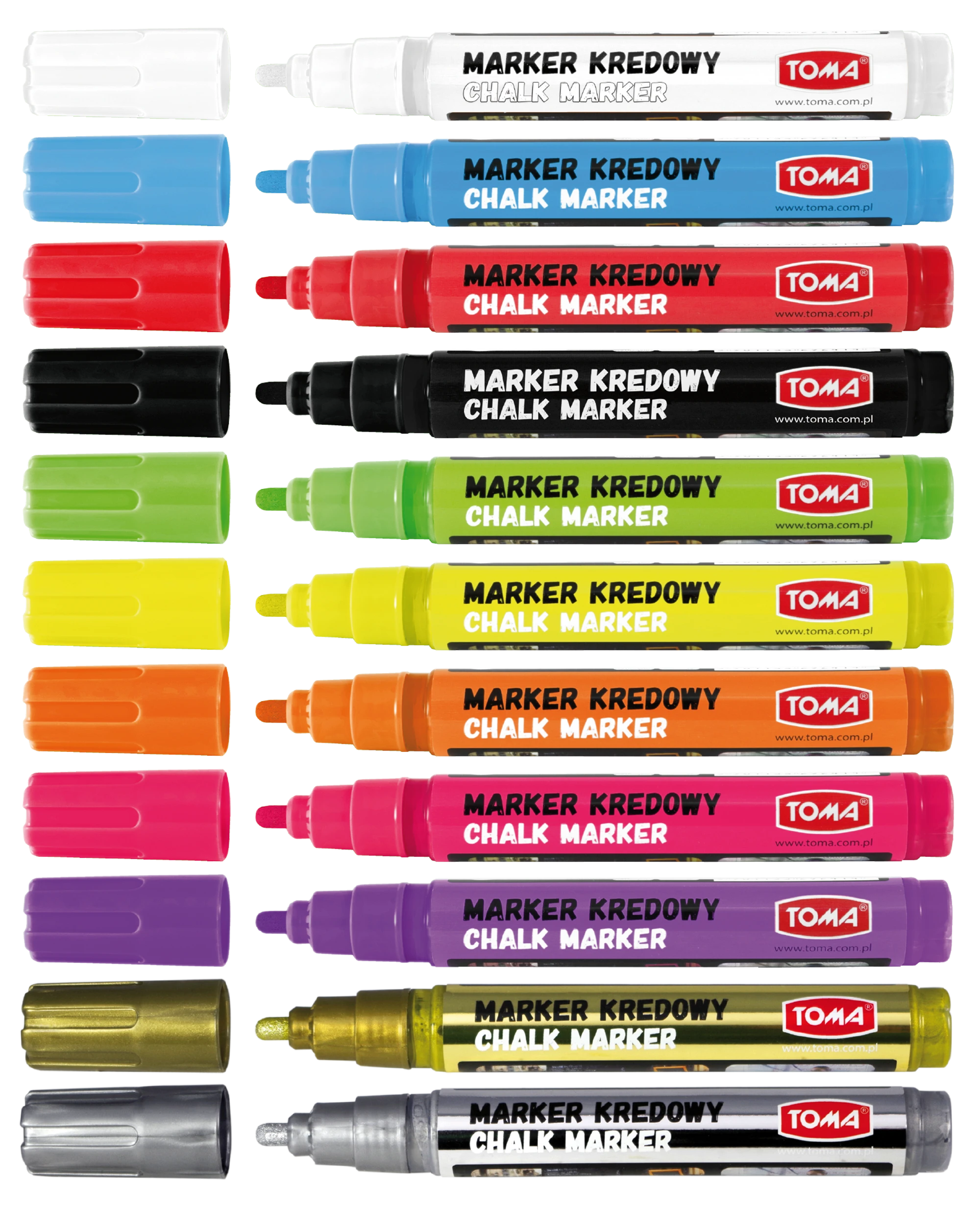 Marker z płynną kredą, do pisania po tablicach czarnych, białych, po szkle i powierzchniach plastikowych. Zmywalny wodą np. tradycyjną gąbką, do użytku wewnątrz pomieszczeń, nasączenie końcówki fibrowe, bezwonny tusz pigmentowy, nie zawiera xylenu.