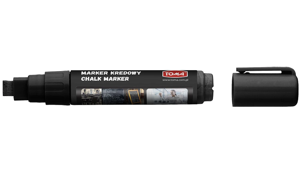 Marker z płynną kredą, do pisania po tablicach czarnych, białych, po szkle i powierzchniach plastikowych. Zmywalny wodą np. tradycyjną gąbką, do użytku wewnątrz pomieszczeń, nasączenie końcówki fibrowe, bezwonny tusz pigmentowy, nie zawiera xylenu.