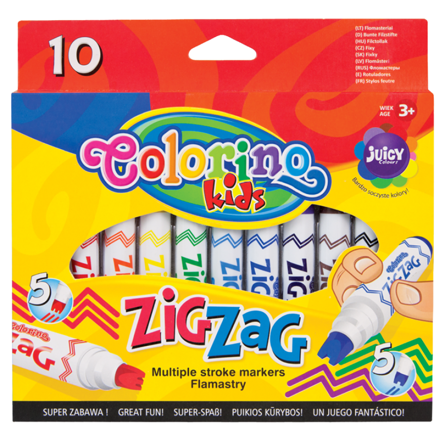 Flamastry ZIG ZAG w 10 kolorach, z dwiema różnymi końcówkami do rysowania jednocześnie dwóch lub trzech linii. Idealne do ozdabiania zaproszeń, kartek okolicznościowych i laurek.