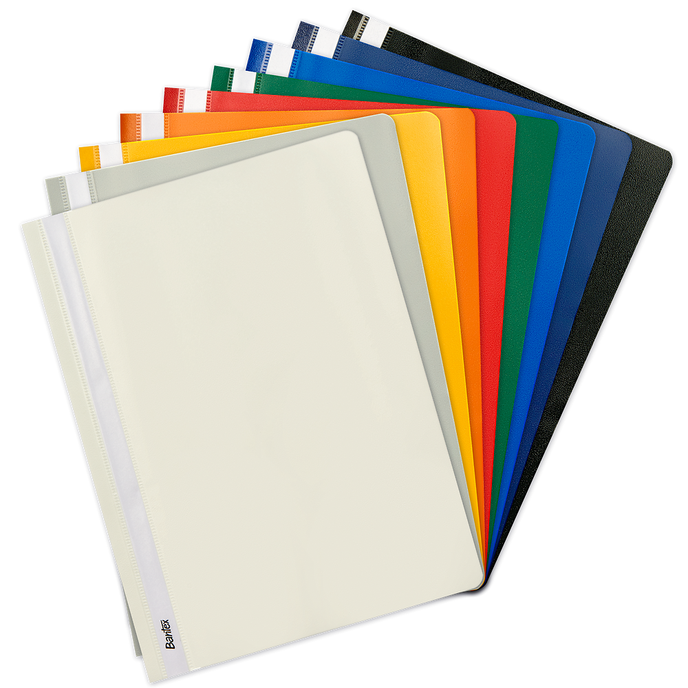 Klasyczne skoroszyty w formacie A4, wykonane z polipropylenowej folii. Przednia okładka o grubości 120 mic. jest przezroczysta dla doskonałej widoczności dokumentów. Tylna okładka o grubości 170 mic. została wykonana z nieprzezroczystej, żółtej folii. Metalowe wąsy bezpiecznie mocują dokumenty w skoroszycie. Na grzbiecie znajduje się wymienny pasek do opisu zawartości.