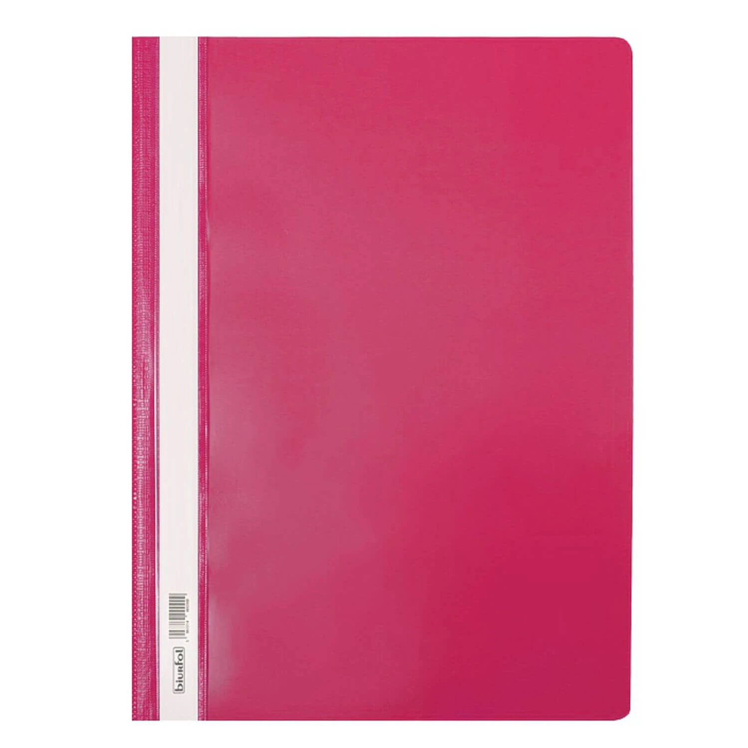 Różowy skoroszyt z folii PVC, przód twardy przezroczysty, tył twardy kolorowy, w środku blaszka i wąs o długości 16,5 cm, umożliwiający wpięcie dokumentów do 2 cm. Skoroszyt posiada wymienny, papierowy pasek do opisu.