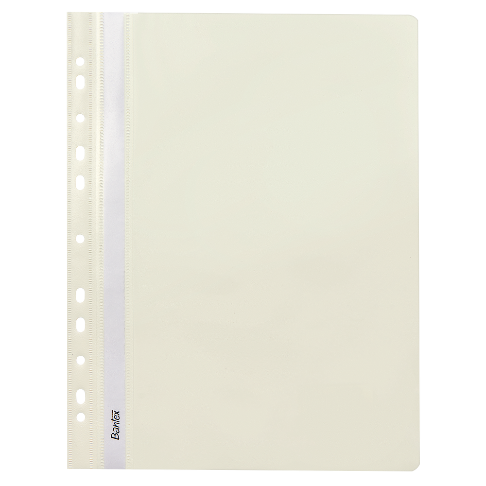 Klasyczny skoroszyt w formacie A4, wykonany z polipropylenowej folii. Przednia okładka o grubości 120 mic. jest przezroczysta dla doskonałej widoczności dokumentów. Tylna okładka o grubości 170 mic. została wykonana z nieprzezroczystej, szarej folii. Metalowe wąsy bezpiecznie mocują dokumenty w skoroszycie. Na grzbiecie znajduje się wymienny pasek do opisu zawartości. Uniwersalna perforacja umożliwia wpięcie skoroszytów do każdego segregatora.