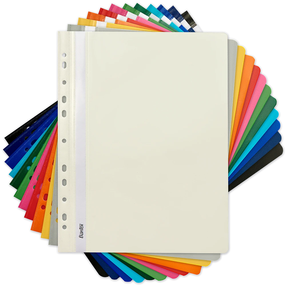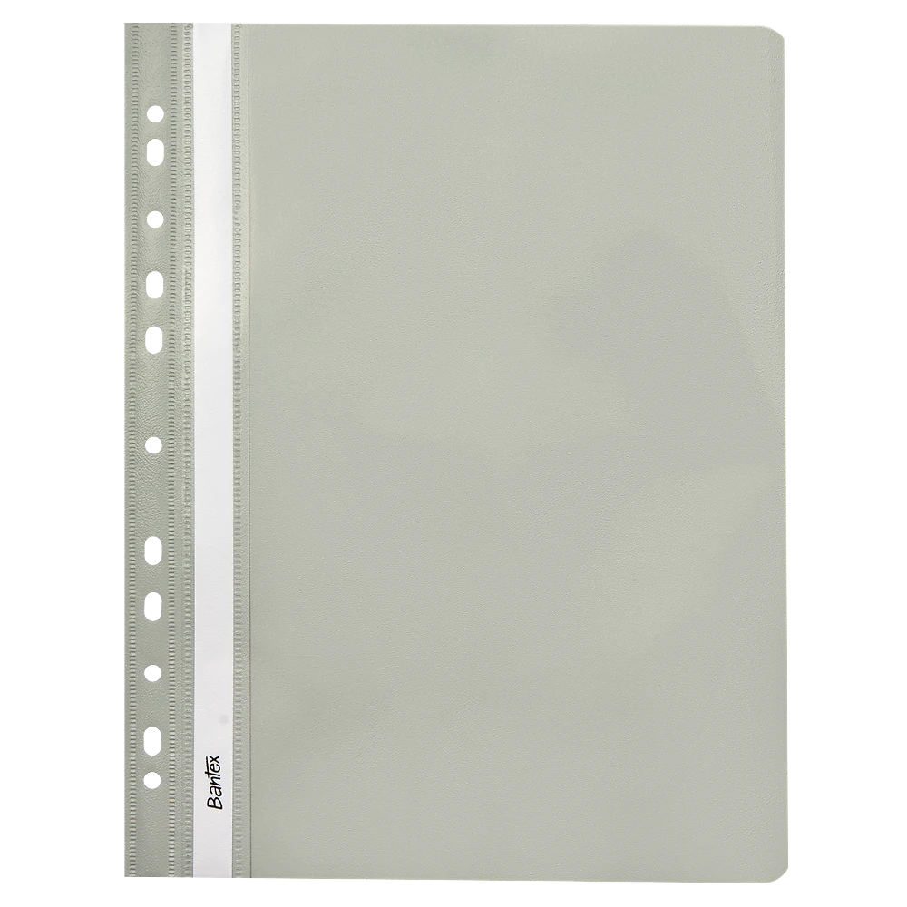 Klasyczny skoroszyt w formacie A4, wykonany z polipropylenowej folii. Przednia okładka o grubości 120 mic. jest przezroczysta dla doskonałej widoczności dokumentów. Tylna okładka o grubości 170 mic. została wykonana z nieprzezroczystej, szarej folii. Metalowe wąsy bezpiecznie mocują dokumenty w skoroszycie. Na grzbiecie znajduje się wymienny pasek do opisu zawartości. Uniwersalna perforacja umożliwia wpięcie skoroszytów do każdego segregatora.