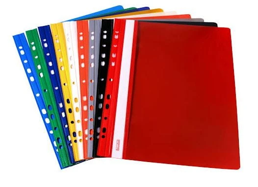 Skoroszyt plastikowy z przezroczystą przednią okładką i kolorową tylną ze sztywnego i mocnego PCV.