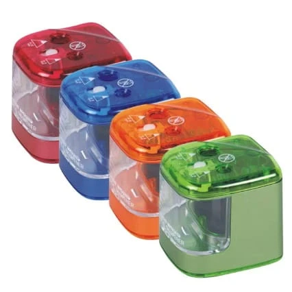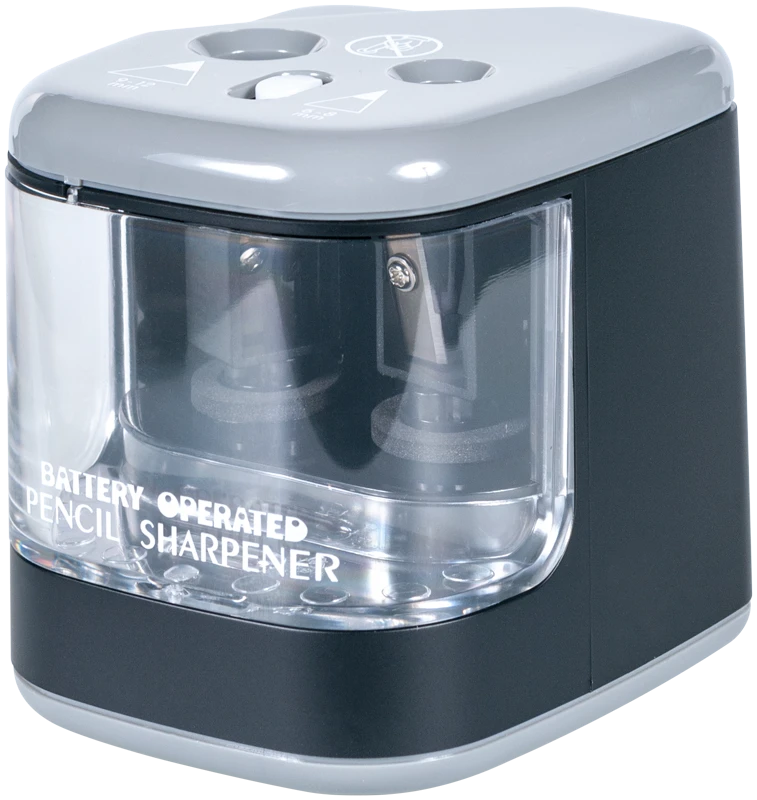 Temperówka podwójna do temperowania kredek i ołówków o średnicach 6-8 oraz 9-12 mm. Posiada duży zbiorniczek na strużyny oraz antypoślizgowe maty zapobiegające przesuwaniu się urządzenia w trakcie temperowania. Zasilanie baterie AA (4 x 1,5 V) lub zasilacz sieciowy o odpowiedniej biegunowości.Komplet nie zawiera baterii ani zasilacza