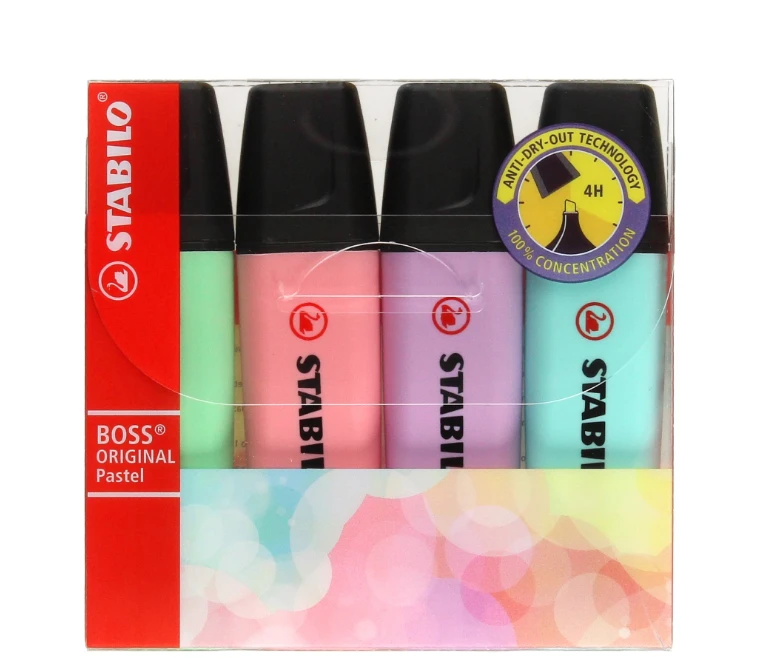 Wysokiej jakości zestaw 4 zakreślaczy z pastelowym tuszem na bazie wody do pisania na wszystkich rodzajach papieru (również faksowym i samokopiującym)