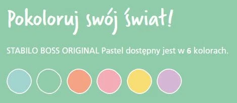 STABILO BOSS ORIGINAL Pastel to kultowy zakreślacz, ale z małą różnicą. Miękkie, modne odcienie nadadzą Twojej pracy subtelnego, ale stylowego wyglądu. Wybór sześciu kolorów gwarantuje, że zawsze możesz mieć przy sobie zakreślacz, który oddaje Twój nastrój.