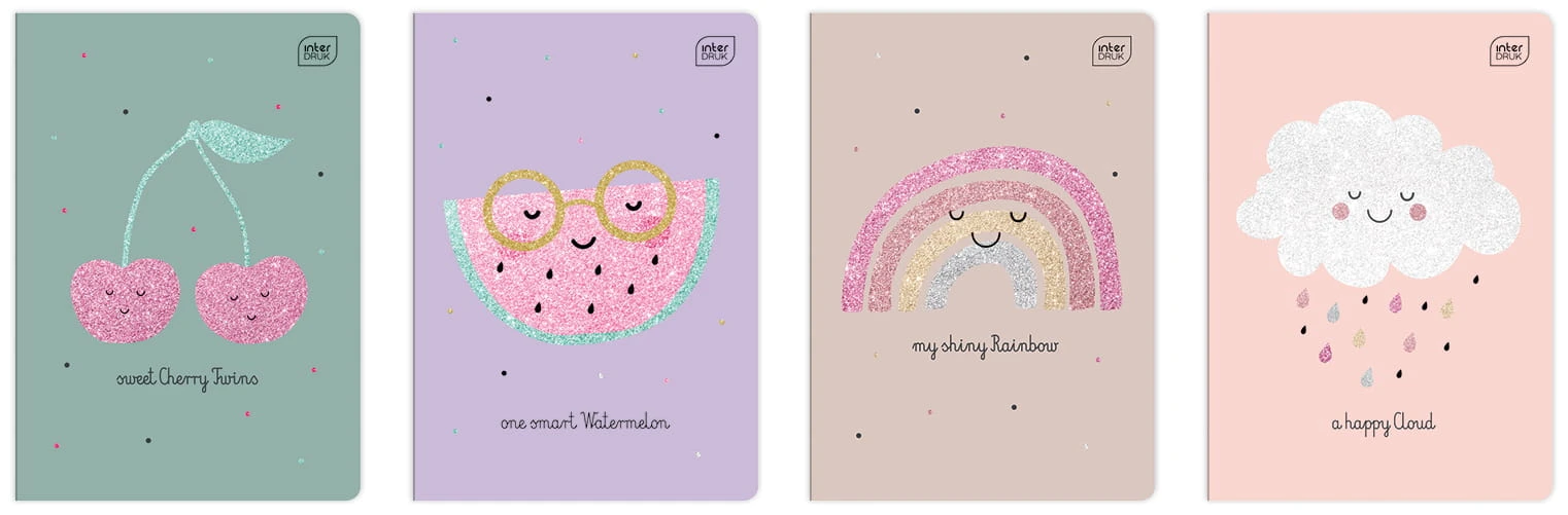 Format: A5. Liczba kartek: 32. Zadruk w kolorową trzylinię. Zaokrąglone rogi. Efektowna i przyciągająca wzrok, kolorowa okładka, wybiórczo pokryta błyszczącym brokatem.